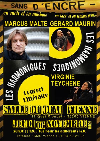 Les mots de Marcus MALTE, extraits de son roman « Les Harmoniques », mis en bouche par l’auteur lui-même et accompagnés, portés, soulevés à bout de voix et de doigts par ces deux magnifiques musiciens que sont Gérard MAURIN (contrebasse) et Virginie TEYCHENE (chant).